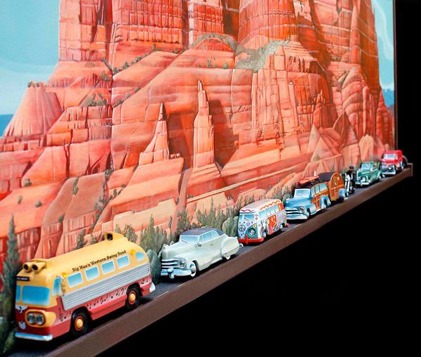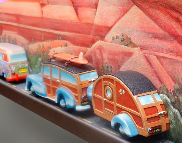 Red Butte With Tourists. 30” x 74” - Mixed media with carved wood vehicles. (Sold)