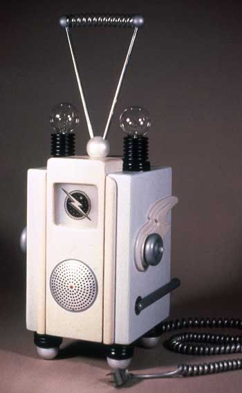 Captain Video. Mixed media with glowing screen and exterior lights, 22-1/2" x 10" x 8-1/2"