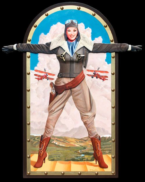 Flying Down to Reno. Mixed media. 35" x 28" A western twist inspired by the grand finale of the movie "Flying Down to Rio" (1933) with "wing walkers" on bi planes flying high above Rio de Janeiro.