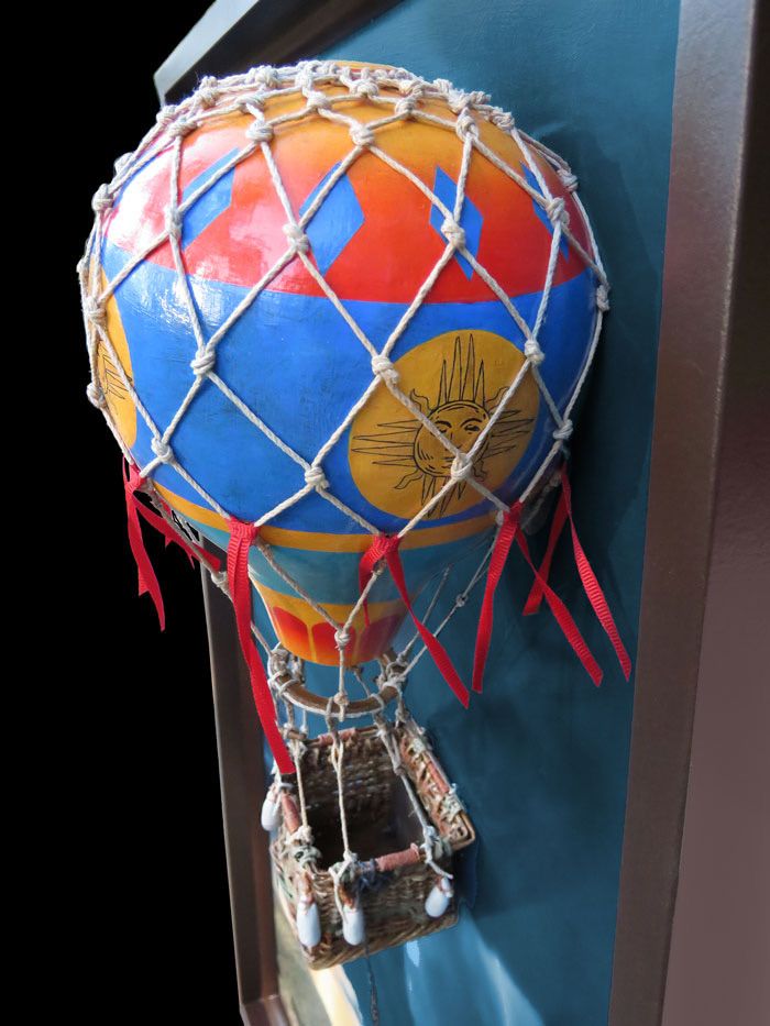 Flying In Spite Of It All. Landscape: acrylic on wood panel. Balloon: woven reed gondola basket, gourd, wood and hemp cord. 31-1/2" x 23" x 5"
