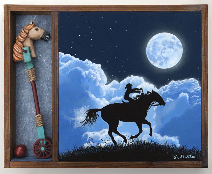 Mixed media with painted canvas and carved wood toy horse.15" x 12" x 2"Changing Horses in the Middle of This Dream.