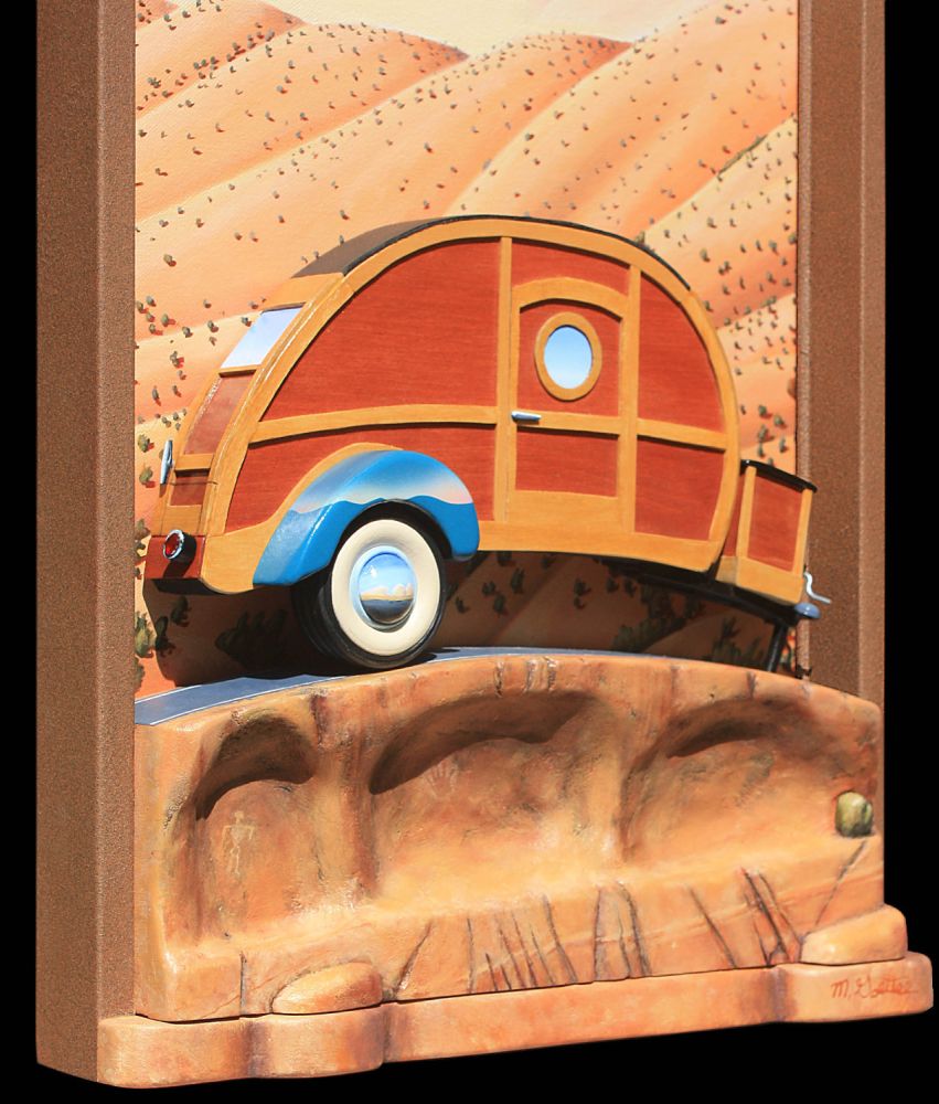 Wild West Woodie. (Station wagon) Carved MDF & wood frame. 25-5/8" x 22" x 3-1/2" (Sold)Li'l Woodie (Trailer) Landscape on both:acrylic on
