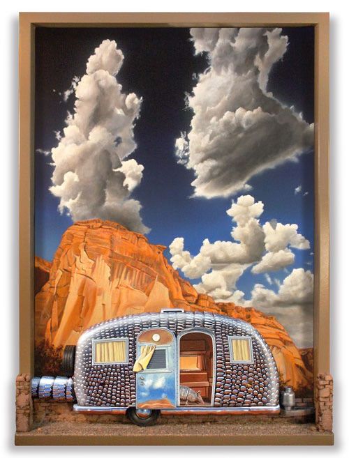 Mothership. Acrylic on canvas, Carved wood Airstream/Armadillo camper trailer. 27" x 19-1/2" (Sold)