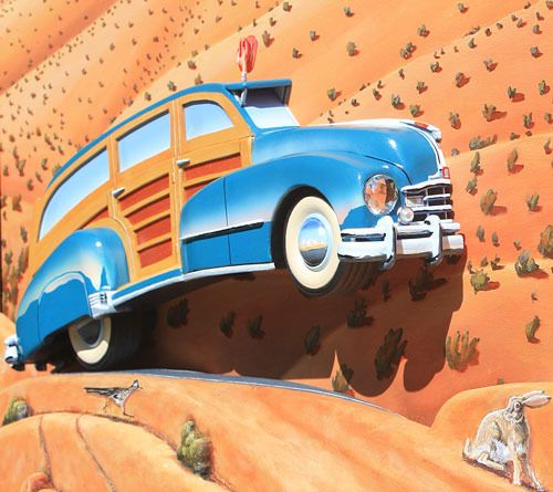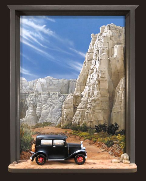 Mixed media: carved wood car and acrylic-on-panel landscape. Approx. 22" x 25" x 3" (Sold) -