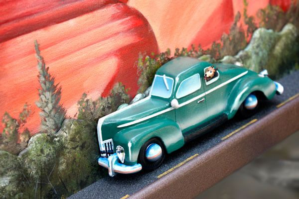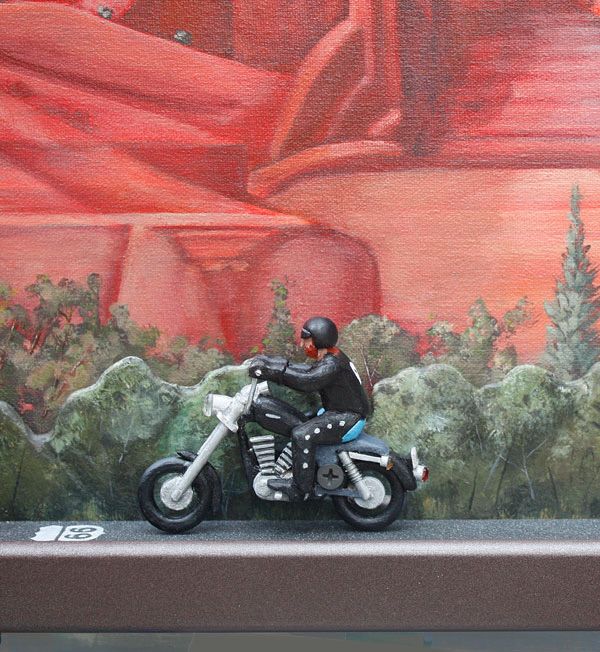 Red Butte With Tourists. 30” x 74” - Mixed media with carved wood vehicles. (Sold)