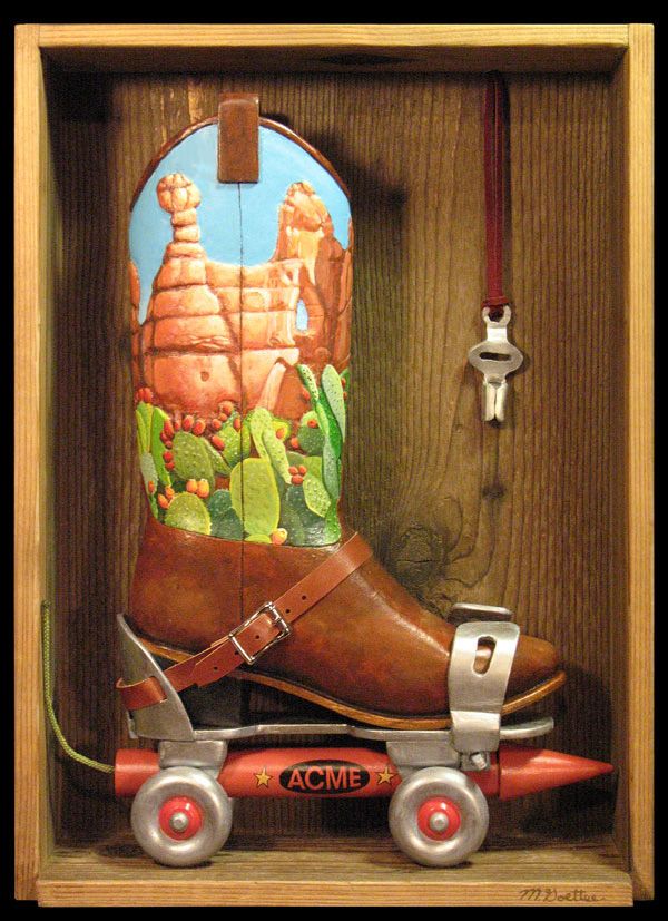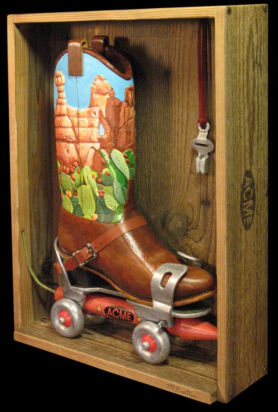 Coyote. Mixed Media: Wooden boot, skate and polymer clay skate key. 17-1/8" x 12-1/2" x 4". See "Tribute to a Fellow Cliff Jumper" in the News section of this site