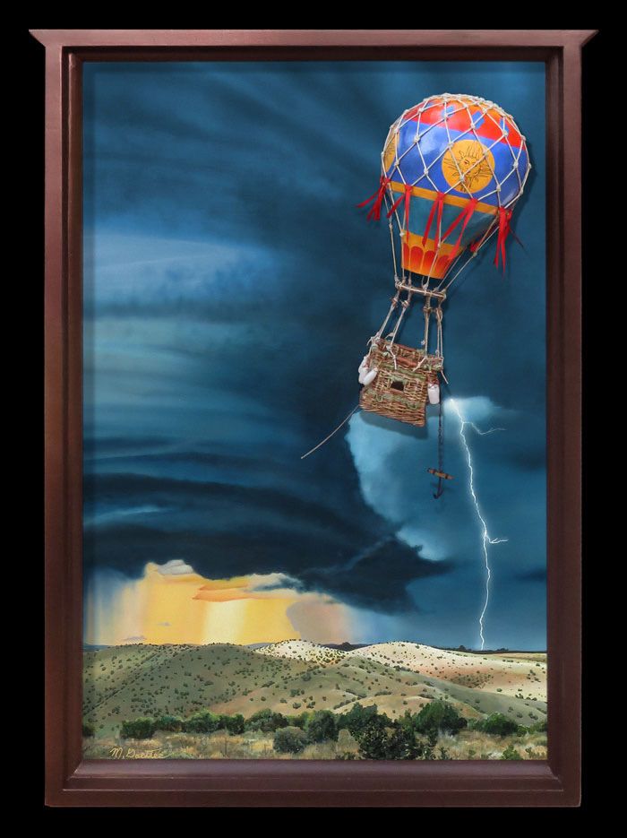 Flying In Spite Of It All. Landscape: acrylic on wood panel. Balloon: woven reed gondola basket, gourd, wood and hemp cord. 31-1/2" x 23" x 5"