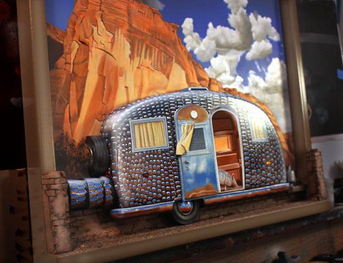 Mothership. Acrylic on canvas, Carved wood Airstream/Armadillo camper trailer. 27" x 19-1/2" (Sold)