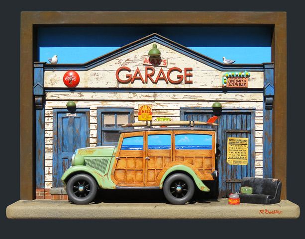 Mixed media: carved wood car and acrylic-on-panel landscape. Approx. 22" x 25" x 3" (Sold) -