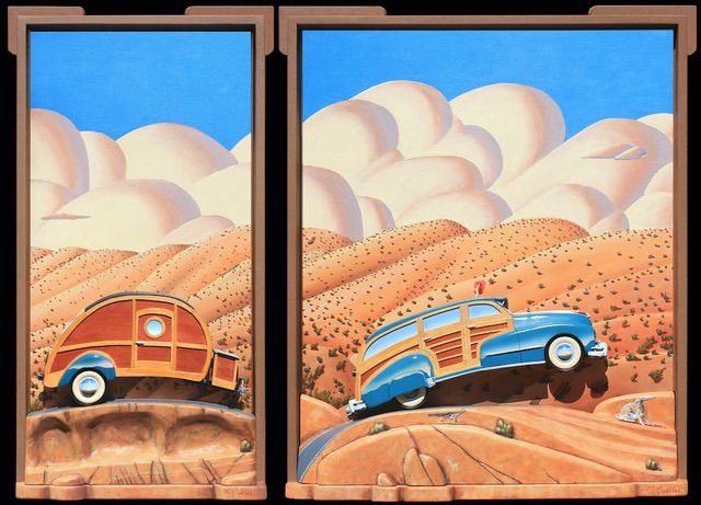 Wild West Woodie. (Station wagon) Carved MDF & wood frame. 25-5/8" x 22" x 3-1/2" (Sold)Li'l Woodie (Trailer) Landscape on both:acrylic on